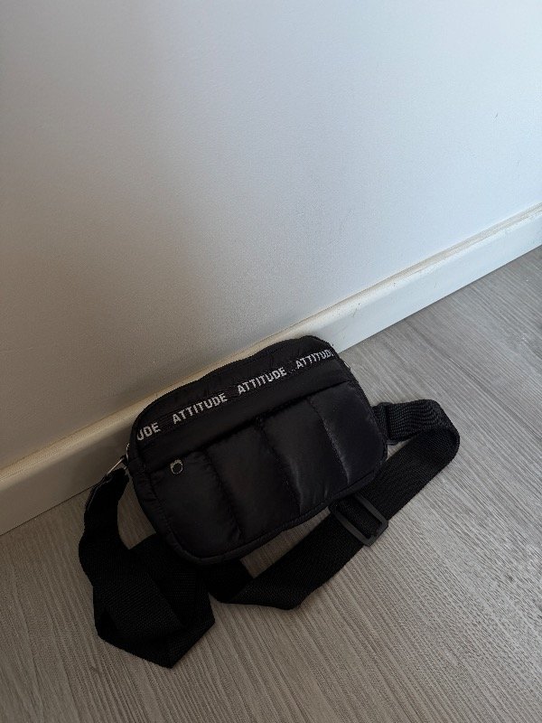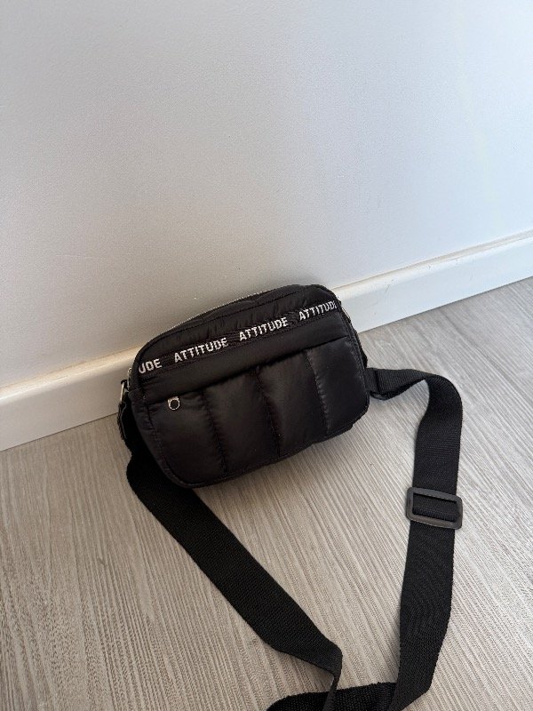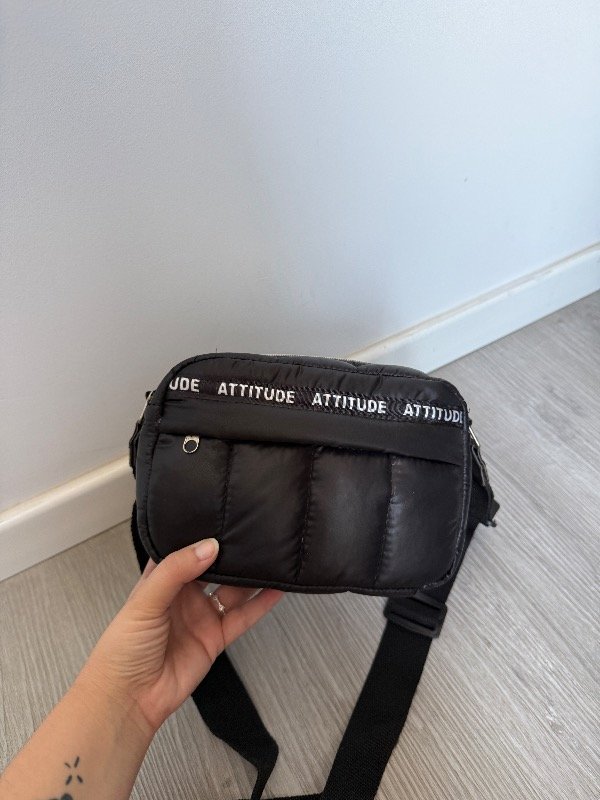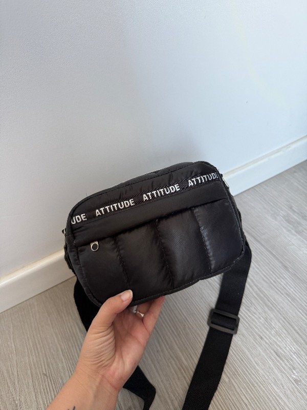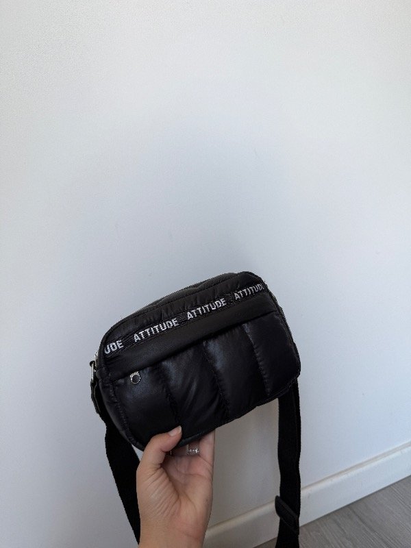 Bandolera de tela puffer negra mas detalle en cinta atittude