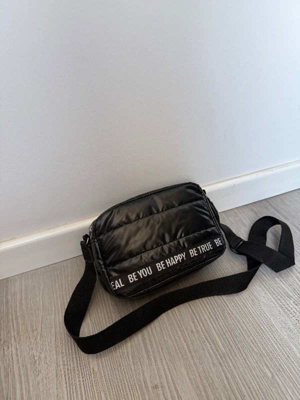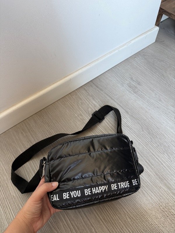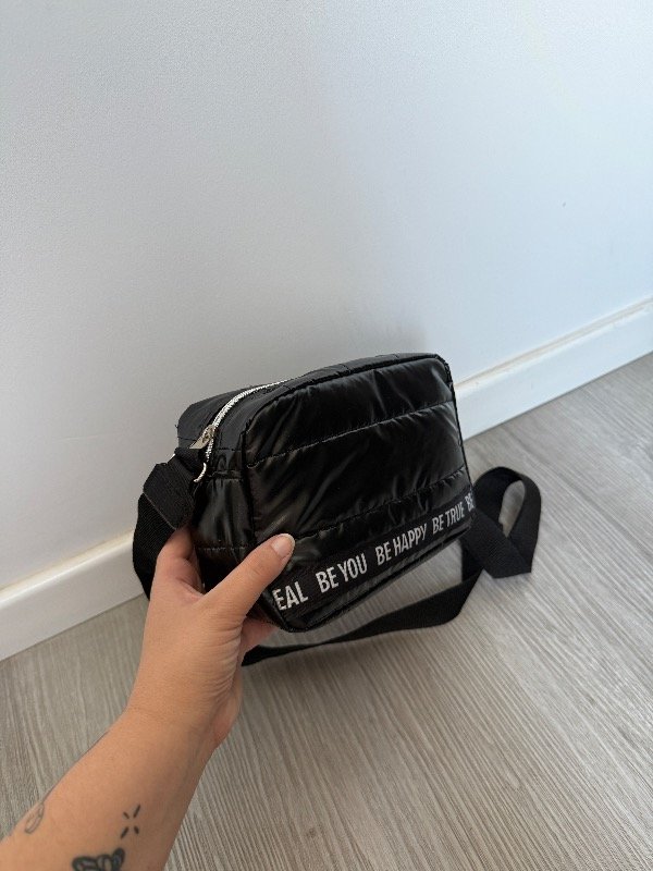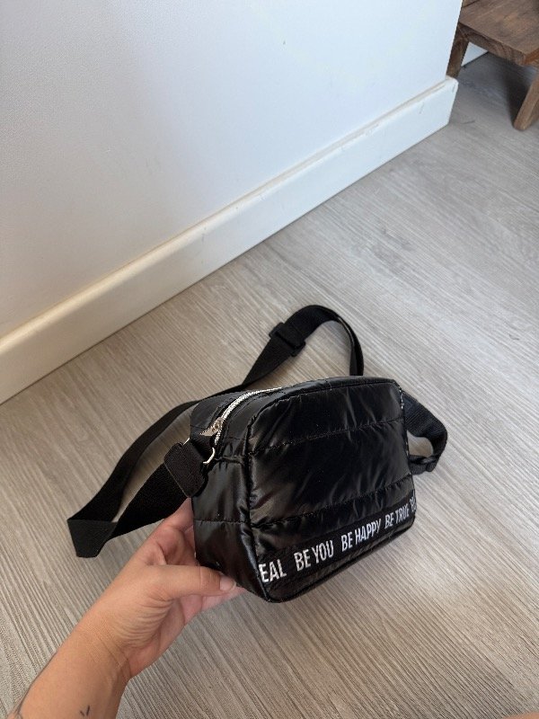 Bandolera de tela puffer negra con detalle en cinta be you be happy
