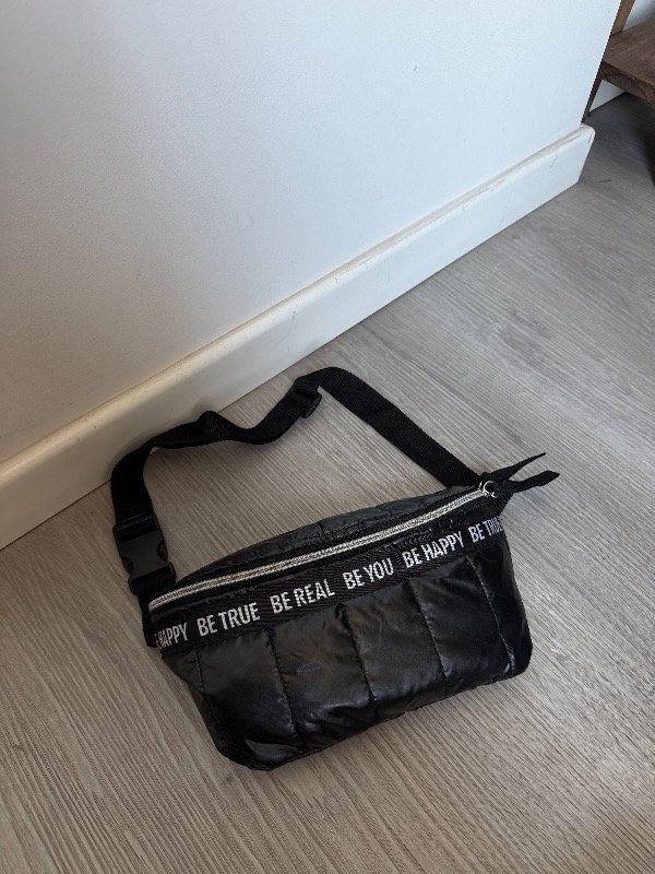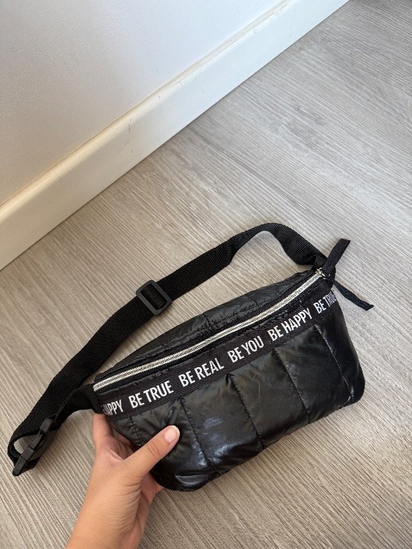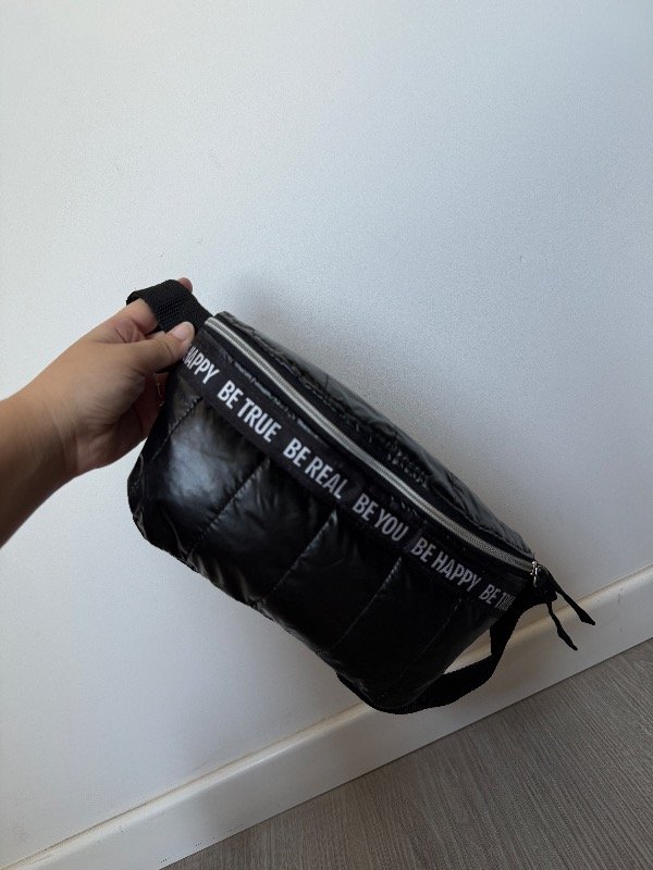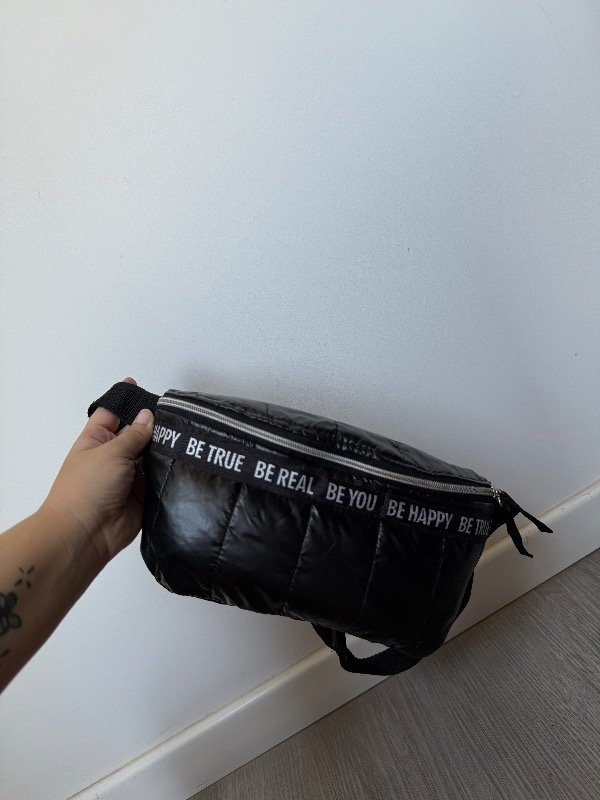 Riñonera de tela puffer en negro metalizado con cinta como detalle